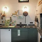 Los electrodomésticos de la cocina incluyen horno de microondas, nevera y utensilios de cocina en una pequeña cocina.